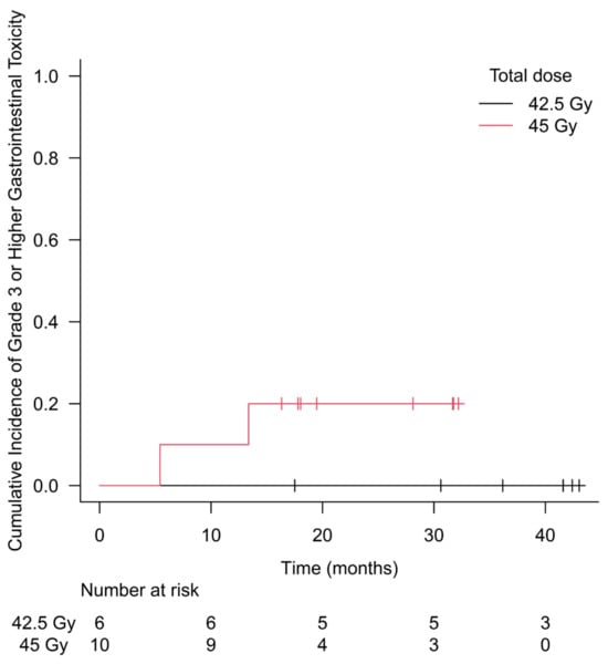 Cumulative incidence of grade 3 or higher gastrointestinal toxicity. No grade 3 or higher toxicity was observed during the follow-up period in the 42.5 Gy group. The 2-year cumulative incidence of grade 3 or higher gastrointestinal toxicity in the 45 Gy group was 20.0% (95% CI 5.4–59.1).