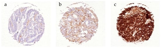 CD10 expression was considered negative in 72.6%, weak in 20.1%, and strong in 7.4% of 1469 interpretable CRC patients (Table 2). A representative picture of CD10 immunostaining is depicted in Figure 1. CD10 expression was significantly associated with earlier tumour stages (p = 0.017). In total, 37.8% of pT1 tumours were positive for CD10, while the proportion decreased with increasing infiltration depth (pT2—33.4%, pT3—26.8%, pT4—21.7%). Interestingly the fraction of strongly expressing CD10 tumours was highest at the pT2 stage (11.3%). Tumour location was also significantly associated with the level of CD10 expression (p < 0.001). While CRC in the ascending colon or the transverse colon expressed CD10 in 18.6% and 15.9%, it was detectable in 34% of left-sided CRC and 28.1% of rectal cancer specimens. In contrast, CD10 expression was unrelated to the nodal status (p = 0.711) and tumour grading (p = 0.397).