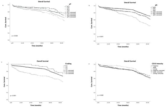 Advanced tumour stages, high grading, and advanced nodal status were associated with poor patient overall survival (Figure 3a–c), as expected; while CD10 expression did not correlate with either overall survival (Figure 3d; p = 0.562) or survival in a subgroup analysis for tumour stage and nodal status (Figure 4a–f).