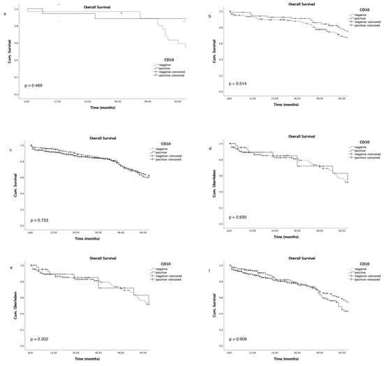 Association of overall survival and CD10 expression in subgroup analysis of tumour stage (pT1–pT4, (a–d)) and nodal stage (pN0–pN1–3, (e,f)).