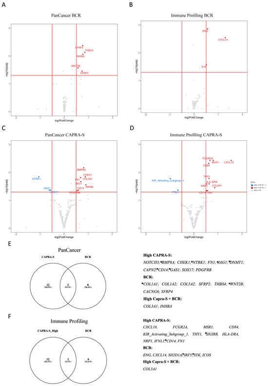 Volcano plot analysis of the significantly altered DEGs associated with BCR included the overexpression of SFRP2, THBS4, INHBA, WNT2B, and SFRP4 (Figure 1A), as well as ENG, CXCL14, and SYK (Figure 1B) amongst the “Low” CAPRA-S group. Similarly, the “High” CAPRA-S group exhibited a substantial number of DEGs (Figure 1C,D). Association with CAPRA-S showed increased expression of BMP8A, CHEK1, FN1, COL3A1, JAG1, CD14, INHBA, and PDGFRB (PanCancer) and FCGR2A, CD84, MSR1, CXCL10, THY1, HLA-DRA, COL3A1, NRP1, CD14, and FN1 (Immune Panel). Reduced expression of NTRK1, GAS1, and SOX17 (PanCancer) and KIR_Activating_Subgroup 1 and IFNL1 (Immune Panel) was also identified. Amongst the overlapping genes between panels, increased expression of CD14, FN1, and COL3A1 were independently detected and associated with high CAPRA-S (Figure 1E,F).