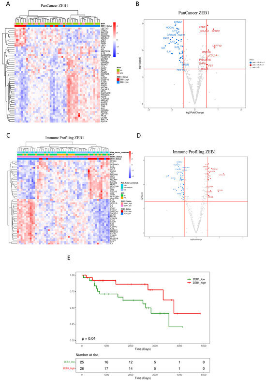 Impact of ZEB1 expression on primary prostate cancer patients. (A–D) Unsupervised heatmaps and Volcano plots showing the top 50 DEGs for patients expressing high levels of ZEB1 in the FMRP cohort (n = 51). Because the display software is limited by the area available for visualizing the top genes, not all significantly expressed DEGs are depicted in the Volcano plots. (E) The Kaplan–Meier plot shows that a low level of ZEB1 expression is associated with a reduced recurrence-free interval (log-rank test, p = 0.04). Adjusted p-value < 0.05 and a log2 fold change > 0.5. Data were plotted using pheatmap and ggplot2.