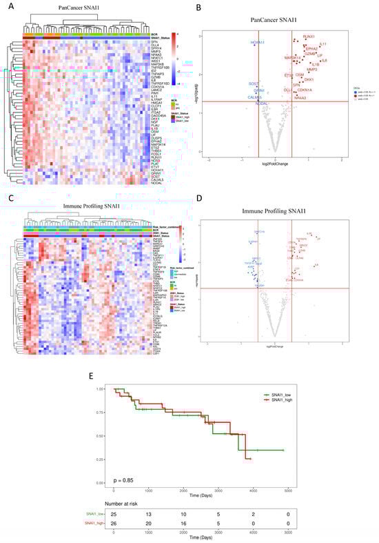 Transcriptome analysis based on the dichotomization of SNAI1 uncovered several DEGs illustrated in Figure 3A,B (PanCancer) and Figure 3C,D (Immune Profiling). Results from the PanCancer panel demonstrated clustering associated with high SNAI1 expression, revealing a reduced expression of HOXA11, GRIN1, SOST, CALML5, and NODAL (Figure 3A,B). Significantly overexpressed genes include RUNX1, ETS2, IL1B, LIF, and IL8. Similarly, DEGs related to SNAI1 expression from the Immune Profiling Panel included the overexpression of CD274 (PDL1), IL1B, and TNFRSF9 (Figure 3C,D).