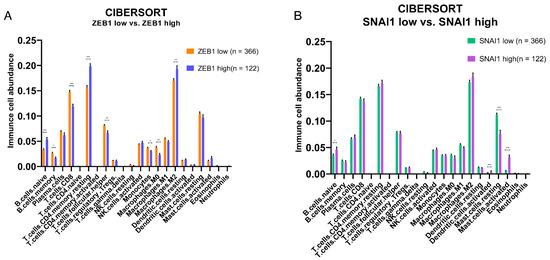 Effects of a high and low expression of EMT transcription factors on the relative abundance of immune cells in the TME of the PRAD-TCGA cohort. Deconvolution-based digital cytometry shows that expression levels of EMT transcription factors influence the relative abundance of immune cell content in the TME. (A) The high ZEB1 group showed an increased abundance of naïve B cells, resting memory CD4+ T cells, and M2 macrophages, and a decreased abundance of memory B cells, CD8 T cells, follicular T helper cells, monocytes, and M0 macrophages. (B) SNAI1 shows an increased abundance of naïve B cells, resting dendritic cells, and activated mast cells, and a decreased abundance of resting mast cells. Results derived from public domain data (TCGA-PRAD). * p-value < 0.05; ** p-value < 0.01; *** p-value < 0.001 by Mann–Whitney test.