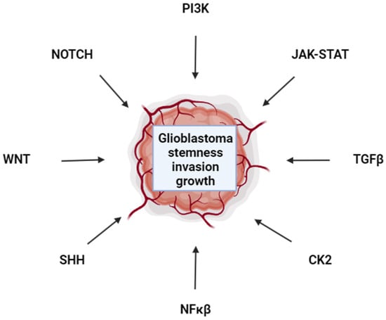 - Drakulic, D.; Schwirtlich, M.; Petrovic, I.; Mojsin, M.; Milivojevic, M.; Kovacevic-Grujicic, N.; Stevanovic, M. Current Opportunities for Targeting Dysregulated Neurodevelopmental Signaling Pathways in Glioblastoma. Cells 2022, 11, 2530. [Google Scholar] [CrossRef] [PubMed]