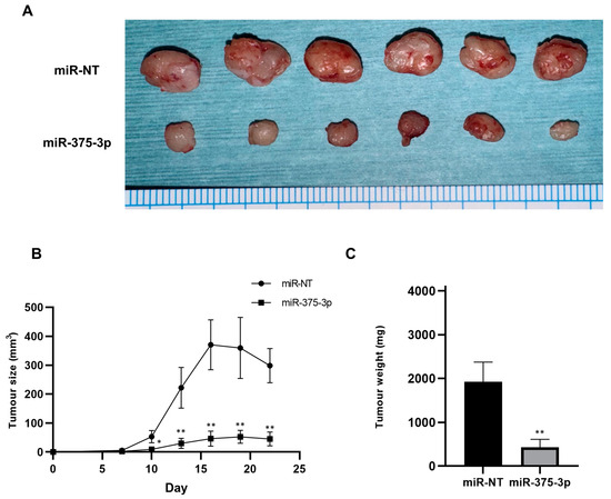 3.3. Effect of miR-375-3p Mimic on In Vivo Growth