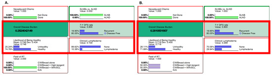 Figure 2. Results from the Alliance A011202 clinical trial settings. Inference using likelihood matching method are presented for (A) the first group [SLNBx followed by RT to CW/Breast plus IMN/SCL] and (B) the experimental group [ALND followed by RT to mixed state of RT to CW/Breast plus high tangent and IMN/SCL]. On the left (A): neoadjuvant chemotherapy was given, followed by SLNBx and RT+IMN/SCL. On the right (B): neoadjuvant chemotherapy was given, then ALND and RT (50% of high-tangent RT and 50% of RT+IMN/SCL) were followed. Key findings of overall disease burden, probabilities of likelihood of being healthy, 7-year DFS, and clinical lymphedema are compared, with an increase in overall disease burden observed in group B, mainly due to the increased risk of lymphedema. Abbreviations: Chemo, chemotherapy; SLNBx, sentinel lymph node biopsy; ALND, axillary node dissection; DFS, disease-free survival; CW, chest wall; IMN, internal mammary nodes; SCL, supraclavicular lymph nodes; N/A, not available; RT, radiotherapy.