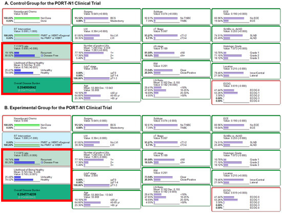 Figure 3. Results from the PORT-N1 clinical trial settings. Inference using likelihood matching method are presented for (A) the control group and (B) the experimental group. Abbreviations: LN, lymph node; Chemo, chemotherapy; WBRT, whole-breast radiation therapy; PMRT, post-mastectomy radiation therapy, TNBC, triple-negative breast cancer; BCS, breast-conserving surgery; 7-Y DFS, 7-year disease-free survival; SLNBx, sentinel lymph node biopsy; ALND, axillary lymph node dissection; LN, lymph node; ECE, extracapsular extension; RM, resection margin; LVI, lymphovascular invasion; ECOG, Eastern Cooperative Oncology Group.