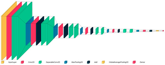 A summary of the model legend: (i) Input preprocessing [inputLayer]: rescales input images and normalize pixel values to the range of 0–1. Effective learning benefits from consistent scaling. (ii) Convolutional layers [Conv2D and SeparableConv2D]: learnable filters extract features (patterns, edges, and textures) from input images and enable the understanding of visual characteristics in biopsy images. (iii) Residual blocks [sequence of 5 layers/operations: 1x MaxPooling2D, 1x Conv2D, 1X Add (operation), and 2X SeparableConv2D]: core component of the architecture that enhances feature representation. (iv) Global Average Pooling [GlobalAveragePooling2D]: reduces spatial dimensions of feature maps, extracts relevant features while minimizing parameters, improves computational efficiency, and prevents overfitting. (v) Dropout layer: randomly sets input units to zero during training, enhancing generalization by reducing reliance on specific features. (vi) Final layer [Dense]: one-neuron layer with sigmoid activation predicts the likelihood of cancerous cells in biopsy images (binary classification).