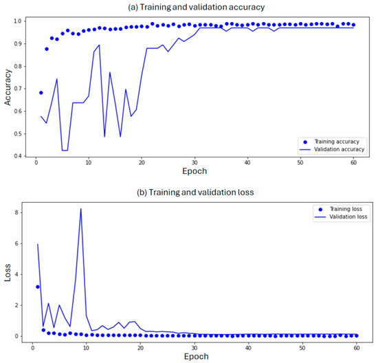 (a) Training and validation accuracy: The blue line represents the training accuracy over multiple epochs, indicating how well the model performed on the training data. The dotted circles correspond to the validation accuracy, reflecting the model’s generalization ability on a separate validation dataset. The x-axis represents the number of training epochs, while the y-axis shows the accuracy, ranging from 0 to 1. (b) Training and validation losses: In the second subplot, the blue line represents the training loss (error) as the model learned. Lower training loss values indicate better convergence. The blue dotted circle curve represents the validation loss, quantifying the discrepancy between predicted and actual values during validation. Similar to the first subplot, the x-axis corresponds to the number of training epochs, and the y-axis represents the loss.