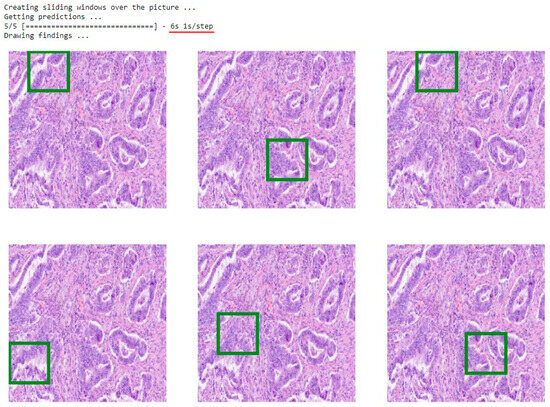 This figure presents a screenshot of the model’s demo results. The text above the screenshot provides immediate feedback after initiating the command. Equal signs indicate loading progress, and the total time taken by the model to generate the figures is displayed at the end. In this example, the model completed the prediction task in 6 s (averaging 1 s per step). The model then automatically generated six identical images based on the input. These images corresponded to the same original image that was inserted. Additionally, the model identified the most optimal regions of interest where cancer cells had been detected. Green rectangles highlight these regions. In the example above, there are six distinct spots, each indicating a region where the presence of cancer was determined.