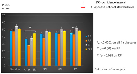 The P-QOL scores on all four subscales significantly decreased at 1 month postoperatively compared with the preoperative scores (p < 0.0001). Further, they almost plateaued 6 months postoperatively. The P-QOL scores on BP recovered to baseline at 3 months postoperatively, but the PF (p = 0.002) and RP (p = 0.028) scores significantly decreased even at 1 year postoperatively compared with the preoperative scores (Figure 1).