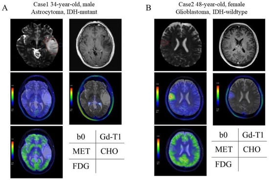 - Kato, T.; Shinoda, J.; Nakayama, N.; Miwa, K.; Okumura, A.; Yano, H.; Yoshimura, S.; Maruyama, T.; Muragaki, Y.; Iwama, T. Metabolic assessment of gliomas using 11C-methionine, [18F] fluorodeoxyglucose, and 11C-choline positron-emission tomography. AJNR Am. J. Neuroradiol. 2008, 29, 1176–1182. [Google Scholar] [CrossRef]