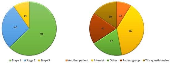 Overall, 211/386 women (55%) knew what lymphedema is; however, 52% of respondents (126/243) stated that they were not informed during their pre-operative assessment of the risk of lymphedema. Twelve patients stated that they received information from their doctor only when they specifically asked about it. Seventy-eight women stated that they were not instructed to evaluate for signs of lymphedema, whereas 78/142 women (55%) stated that they were not informed about available protective measures. Approximately 52.5% (155/295) of women indicated that any information they received about lymphedema they had to search themselves online or from patient support groups (Figure 1).