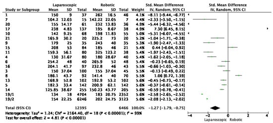 For surgery duration, 18 studies were analyzed. The standardized mean difference (SMD) was −1.27 [−1.79, −0.75], indicating that laparoscopic surgery took significantly less time than robotic surgery. This difference was statistically significant, with a p < 0.00001 (Figure 2).