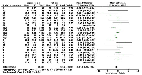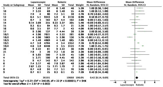 Length of hospital stay (days) was reported in 20 studies, shown in Figure 3. The pooled data indicated a total mean difference of 0.42, meaning shorter hospitalization for robotic surgery, with a p value of 0.003 (Figure 3).