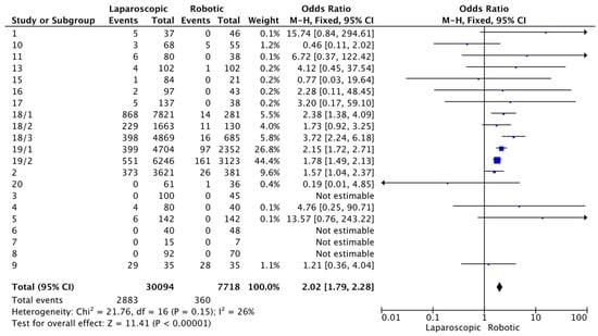 The analysis of conversion rates indicated that laparoscopic surgery had a higher likelihood of conversion to open surgery compared to robotic methods, with an odds ratio of 2.02 (95%CT, [1.79, 2.28]). This suggests a statistically significant difference, supported by low heterogeneity (Z = 11.41, p < 0.00001). However, it is crucial to consider this information within a broader spectrum of surgical practice. Conversion from laparoscopic to an open approach should not be viewed as a shortfall of the laparoscopic method. Instead, it is often a reflection of prudent surgical judgment in which the primary concern is patient safety and optimal outcomes. Conversions are typically associated with intraoperative challenges such as unexpected anatomical complexities, technical difficulties or other patient factors that may not and cannot be fully appreciated preoperatively. By choosing to convert to an open procedure, when necessary, surgeons demonstrate adaptability and commitment to the best outcomes for the patient. Even though our study highlights a numerical difference in conversion rates, this should not be interpreted as a failure of the laparoscopic approach.