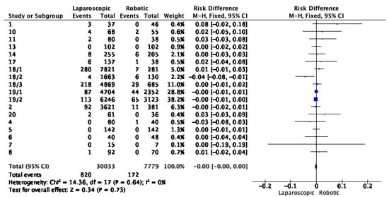 The pooled results for anastomotic leak between laparoscopic and robotic surgery showed no significant difference between the two methods, with a risk difference of −0.00 (95% CI [−0.00, 0.00]). The heterogeneity was non-existent, meaning no variation between studies, with an overall effect of −0.34 and a p value of 0.73, suggesting no statistically significant difference between the two surgical techniques. The results are shown in Figure 5.