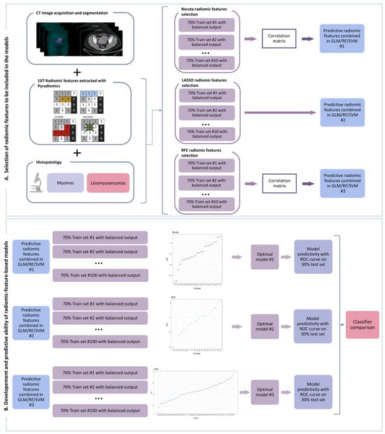 Workflow analysis composed of two steps: creation of the radiomic model (A) and comparison between the machine-learning-based optimal classifiers (B) as detailed in the manuscript. GLCM: Gray Level Co-occurrence Matrix; GLRM: Gray Level Run Length Matrix; GLSZM: Gray Level Size Zone Matrix; NGTDM: Neighboring Gray Tone Difference Matrix; GLM: generalized linear model; RF: random forest; SVM: support vector machine; ROC: receiver operating characteristic; LASSO: Least Absolute Shrinkage and Selection Operator; RFE: recursive feature elimination.
