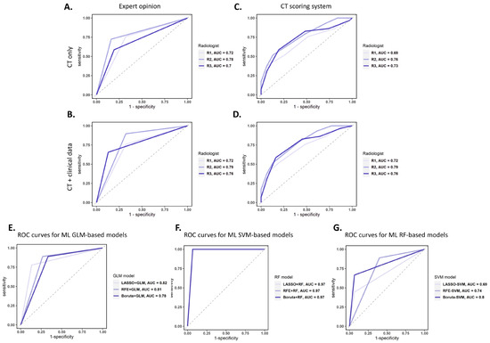 ROC curves for the diagnostic accuracy of radiologists’ expert opinions in the presence of CT scans only (A) and with clinical data at hand (B). ROC curves for the diagnostic accuracy of a CT scoring system containing nine CT items (C) and with clinical suspicion (D). (E–G) ROC curves on the test dataset for the diagnostic accuracy of the best GLM-based (E), SVM-based (F), and RF-based (G) classifier models for each radiomic feature selection method. AUC: area under the curve; ROC: receiver operating characteristic; CT: computed tomography; ML: machine learning; GLM: general linear model; SVM: support vector machine; RF: random forest; LASSO: Least Absolute Shrinkage and Selection Operator.