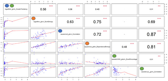 Autocorrelation plots of the features selected by the optimal models reported in Table 3. Pearson’s rho coefficients are reported in the upper right panels, while p-values (i.e., p < 0, 0.001, 0.01, 0.05, 0.1, and 1) are expressed as symbols (i.e., “***”, “**”, “*”, “.”, and “ “, respectively). The blue, orange, and green dots represent the features selected by the optimal Boruta, Least Absolute Shrinkage and Selection Operator (LASSO), and recursive feature elimination (RFE) machine-learning-based approaches, respectively.