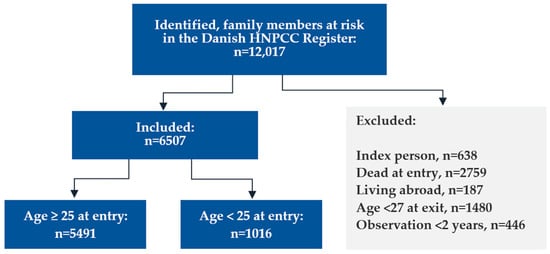 The first Lynch syndrome case in Denmark was genetically tested on 12 December 1993, defining the beginning of the study period, and the first information letter was sent from the national Danish HNPCC Register on March 16, 1995, defining the onset of provider-mediated contact. The end of the study was 26 April 2023, when all Lynch syndrome relatives at risk registered in the Danish national HNPCC Register with a valid CPR number were identified (n = 12,017, Figure 1). “Family members at risk” was defined as blood-related family members being either (1) carriers of a Lynch syndrome-defining pathogenic variant, (2) first-degree relatives to such carriers, (3) genetically untested relatives affected by a Lynch syndrome-associated cancer, or (4) genetically untested first-degree relatives to such affected patients. A few second-degree relatives were included if their relevant parent died younger than 60 years. Obligate non-carriers were not included.