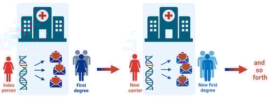 In Denmark, cascade genetic testing in hereditary cancer syndromes relies on specific regulations in the national legislation (https://dsmg.dk/wp-content/uploads/2022/11/Uopfordret-kontakt-til-risikopersoner.pdf (accessed 5 March 2024)) [20]. Inhere, medical doctors are allowed to directly contact a Danish citizen under the following conditions: