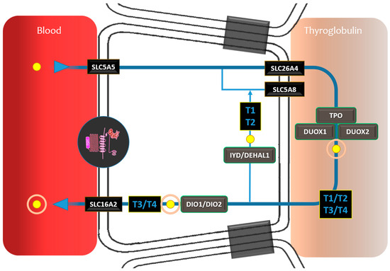 RAI theranostic circuit involving all the steps from uptake, transport, organification, and thyroid hormone release. Gene expressions critical for theranostic TDS. SLC5A5 (solute carrier family 5 (sodium/iodide cotransporter), member 5): sodium–iodide symporter activity, responsible for the uptake of iodine in the thyroid. SLC26A4 (solute carrier family 26 (anion exchanger), member 4): iodide transmembrane transporter activity. TPO (thyroid stimulating hormone receptor): iodination of tyrosine residues in thyroglobulin and phenoxy-ester formation between pairs of iodinated tyrosines to generate the thyroid hormones, thyroxine, and triiodothyronine. DUX01 (dual oxidase 1): involved in the synthesis of thyroid hormone. DUX02 (dual oxidase 2): involved in the synthesis of thyroid hormone. DIO1 (deiodinase, iodothyronine, type I): activates thyroid hormone by converting the prohormone thyroxine (T4) by outer ring deiodination (ORD) to bioactive 3,3′,5-triiodothyronine (T3). DIO2 (deiodinase, iodothyronine, type II): activates thyroid hormone by converting the prohormone thyroxine (T4) by outer ring deiodination (ORD) to bioactive 3,3′,5-triiodothyronine (T3). IYD (iodotyrosine deiodinase): encodes an enzyme that catalyzes the oxidative NADPH-dependent deiodination of mono- and diiodotyrosine, which are the halogenated byproducts of thyroid hormone production. SLC5A8 (solute carrier family 5 (sodium/monocarboxylate cotransporter), member 8): transport iodide by a passive mechanism. SLC16A2 (solute carrier family 16 member 2): encoded protein facilitates the cellular importation of thyroxine (T4), triiodothyronine (T3), reverse triiodothyronine (rT3), and diidothyronine (T2). TG (thyroglobulin): substrate for the synthesis of thyroxine and triiodothyronine as well as the storage of the inactive forms of thyroid hormone and iodine. TSHR (thyroid stimulating hormone receptor): receptor for thyrothropin and a major controller of thyroid cell metabolism.