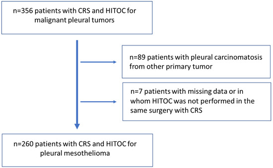 In this retrospective multicenter study, clinical outcomes of 260 patients with a primary diagnosis of epithelioid or non-epithelioid PM from the German HITOC study were analyzed (Figure 1). Between 2008 and 2019, four high-volume departments of thoracic surgery in Germany collected clinical data on pre-, peri-, and postoperative variables according to a common protocol [14]. The study was funded by the German Research Association (DFG, RI2905/3-1). The trial was registered in the German Registry of Clinical Studies (DRKS-ID: DRKS00015012). The approval of the Ethics Committee of the University of Regensburg (No. 18-1119-104) and of the ethics committees of the respective participating centers were obtained. All patients underwent elective CRS and HITOC within one surgery. The surgical procedures and HITOC have been conducted as described before [12,15]. The existing database was supplemented by the additional collection of 64 clinical and follow-up data, which were updated until November 2021. One patient from the entire study population (n = 261) was excluded because he was initially treated for local recurrence of PM.