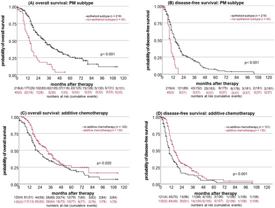 Based on our retrospective data analysis, the interval from the end of multimodal treatment to tumor recurrence or progression was significantly improved, even after the multivariable analysis, especially in patients receiving additive chemotherapy. It is possible that adjuvant chemotherapy, usually administered postoperatively, can reach residual tumor cells through the large, well-vascularized wound surface. The results of the EORTC trial may provide recommendations on the timing of multimodal therapy. Nevertheless, our results clearly support the inclusion of additive chemotherapy in a multimodal treatment approach. Some centers in our multicenter analysis have not included additive chemotherapy in their standardized treatment regimens in recent years. As a result, we may have reduced the selection bias and the impact of a postoperative decreased general condition on the completion rate of multimodal treatment with additive chemotherapy. This may support our conclusion that additive chemotherapy has a positive impact on disease progression. In accordance with the latest recommendations of the WHO 2021 classification, future analyses may show whether there is an impact on therapeutic decisions and the treatment response when epithelioid mesothelioma is classified as a low-grade or high-grade tumor subtype [29].