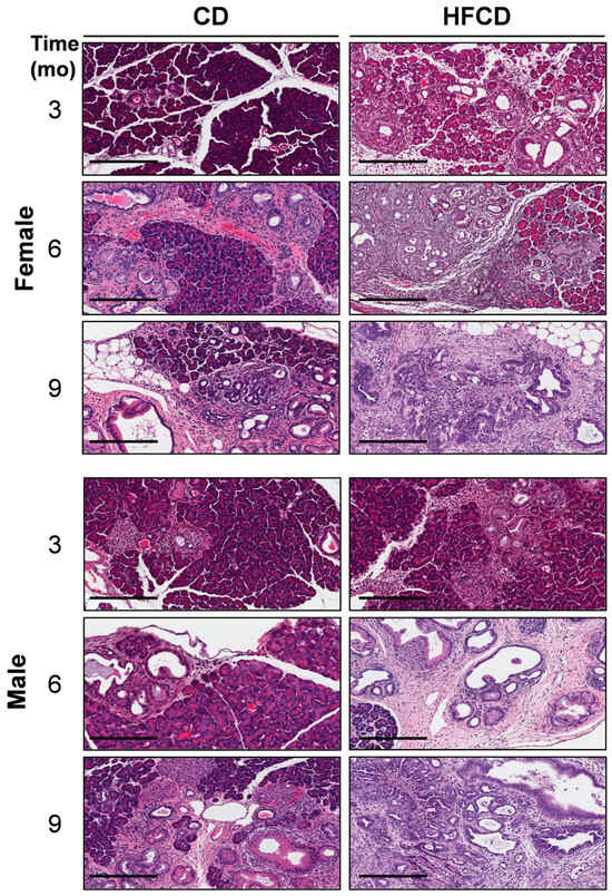 DIO-induced PDAC development. Representative pancreas histology (H&E) of PDAC development in female (upper panels) and male (lower panels) KC mice on a control diet (CD) versus a high-fat, high-calorie diet (HFCD) at 3, 6, and 9 months (mo) of age reveals extensive loss of acinar tissue concomitant with increased areas of fibrotic stroma, ADM, PanIN, and PDAC in HFCD-fed mice. Tumor tissues identified by a pathologist were selected to represent the effect of DIO in females at 9 mo and in males at 6 and 9 mo. Scale bar: 200 μm.