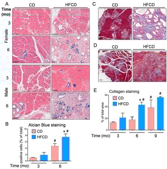 (A), representative Alcian Blue (AB) staining detects classical PanIN in the pancreas of KC mice fed a CD and HFCD. (B), quantitation of QuPath-classified AB+ cells in male and female pancreas tissues at different time points. (C), representative images of Trichrome staining at 6 mo show increases in collagen-stained areas in CD-fed and HFCD-fed KC mice. (D), stromal areas are also filled with ECM proteins in mice on a CD at 9 mo, and DIO induces smaller increases in mice exhibiting invasive pancreas/liver tumors. A dotted line demarcates a frontier between a tumor and an invaded liver area. (E), quantitation of a tissue area containing collagen stained blue with Masson’s Trichrome in KC mice on a CD versus an HFCD. The graphs in (B,E) show mean ± SEM. *, p < 0.05 vs. CD; #, p < 0.05 vs. 3 mo; ANOVA + post hoc Fisher’s LSD test. Scale bars, (A), 100 nm; (C,D), 200 nm.