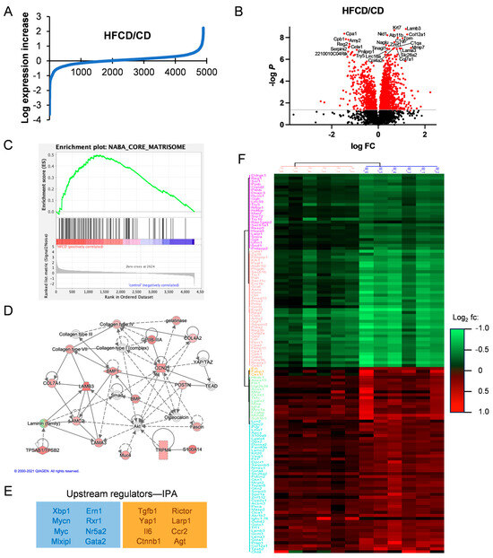 The data in Figure 1, Figure 2 and Figure S1 further confirm DIO-induced PDAC development in KC mice, and recapitulate the roles of PanIN, fibrosis, and altered cellular phenotypes in PDAC progression, but do not identify major changes in protein expression underlying these events. To examine specific DIO-induced increases and decreases in proteins accompanying PDAC development, we performed quantitative proteomic analysis and compared HFCD-fed to control-fed KC mouse pancreases. The proteins discovered here with at least two unique peptides from both female and male KC mice at 3, 6, and 9 mo are listed in Supplementary Table S1. We plotted the log expression levels of all proteins as the ratio of HFCD/CD to show DIO-induced, differentially expressed proteins, as illustrated in Figure 3A. DIO significantly (≥1.5-fold, p < 0.05) induced the overexpression of 188 proteins, and suppressed (≤0.67-fold, p < 0.05) 141 proteins. The volcano plot in Figure 3B illustrates selected highly altered and significant proteins. Prominent reduced proteins included secreted digestive enzymes; Reg2, a Reg family member that protects from diabetes [24]; and Serpini2/Pancpin, a serpin family member crucial to maintaining acinar cell secretory function and identity [25]. Several matrisomal proteins were increased, including the collagens Col4a2, Col7a1, Col12a1, and complement C1qa and C1qb; laminins Lama3 and Lamb3; the matrix metalloprotease Mmp7; the lipocalin family protein Lcn7/Tinagl1; and the laminin-binding protein Nidogen-/Nid1. A full 10 of the 17 most prominent overexpressed proteins were matrisomal. Thus, matrisomal proteins form a major component of the DIO-induced elevated proteins in KC mice.