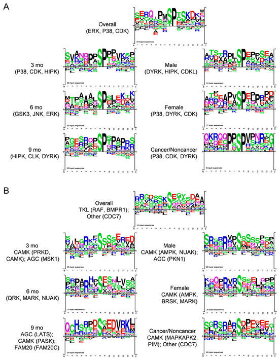 Motif analysis of 25 top (A), Proline-directed and (B), non-Proline-directed phosphopeptides that increased during DIO-induced PDAC induction in KC mice, using PhosphoSitePlus Tools. Each sequence logo depicts the preferred amino acid residues most found around the targeted Ser residues, with the preferred (larger) residues at each position stacked on top of lower-scoring ones. Kinases targeting the main sequences were also calculated and are shown.