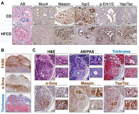 Whereas α-Sma+ myCAFs populated only parts of the Trichrome-stained areas, it was important to further assess the subregions with highly clustered myCAFs. Our IHC indicated reactive stroma containing α-Sma+ cells sometimes associated closely with mucinous PanIN. However, we also noted thick concentrations of α-Sma+ cells around distinct nonmucinous epithelioid cell-based lesions, lacking staining for AB or Maspin, markers we associated with PanIN. Figure 5C shows one such lesion close to a PanIN lesion with contrasting staining patterns at 9 mo in a CD-fed mouse. We propose that nonmucinous, flat epithelioid lesions with irregular structures surrounded by α-Sma+ cells represent atypical flat lesions (AFLs), previously described by Esposito and colleagues [39,40]. The nearby PanIN lesion, by contrast, expresses AB+ mucin, stains Maspin+, and its milieu is richer in Trichrome+ collagen but contains fewer α-Sma+ myCAFs. Notably, cells of both PanIN and AFLs stained robustly for Yap/Taz, mostly in the nucleus (Figure 5C).