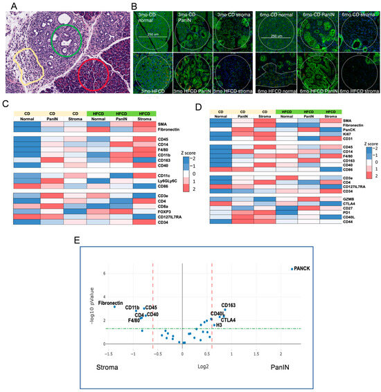 NanoString GeoMx® Digital Spatial Profiling of DIO-induced immune cell subtype enrichment in stromal and PanIN areas in KC mice. We analyzed pancreas tissues from CD- and HFCD-fed KC mice at 3 mo and 6 mo (n = 3 mice/group). We collected 8 ROIs per slide, total of 20 normal, 37 stromal, and 39 PanIN data points, and applied GeoMx® Housekeeping and controls, immune cell profiling, immune cell typing, and immune activation status antibody panels. (A), representative H&E staining at 6 mo at 100 μm scale, to illustrate selected normal (red circle), PanIN (green circle), and stromal (yellow irregular) ROIs. (B), IF staining for epithelial cell pan-cytokeratin- (green), immune cell CD45- (yellow), and cell nuclei (blue)-guided ROI selection of normal, PanIN, or stromal areas as in (A). Scale bar, 250 μm. (C,D), heat maps of significant DIO-induced changes at (C), 3 mo; (D), 6 mo. Diet drove many important shifts in immune distribution at 3 mo. (E), volcano plot of PanIN (Pan) vs. stromal (St) regions. Stromal areas attracted immune cells (CD45) including myeloid cells (F4/80) and myofibroblasts (α-Sma). In contrast, PanIN area preferentially attracted immunosuppressive M2 macrophages (CD163). Dashed lines indicate cutoffs for significance (green horizontal, p = 0.05) and fold change (red vertical, plus or minus 1.5-fold) levels.