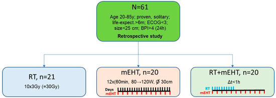 Sixty-one patients were eligible according to the inclusion criteria. This cohort was divided into three groups: (1) RT alone (n = 21); (2) mEHT alone (n = 20); and (3) combined RT + mEHT (n = 20). The inclusion period was from January 2018 to December 2022. Figure 1 illustrates the grouping of the patients, and Table 1 shows the patients’ baseline characteristics.