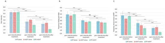 Changes in pain intensity (A), analgesic frequency (B), and BTP frequency (C) in the different patient groups four weeks after treatment; *** (p < 0.00005); NS, no significance.