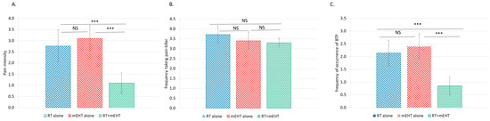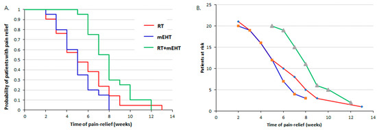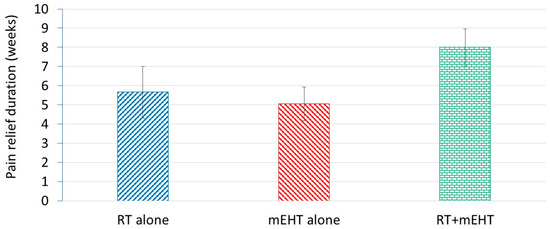 Nonparametric Kaplan–Meier estimation showed significantly better pain relief over time with the combined treatment than with RT or mEHT alone, with no significant difference between the two monotherapies (Figure 8).