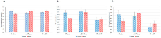 BPI scores for patients with bone metastases in the pelvis and spine: (A) at baseline; (B) immediately after treatment; and (C) and four weeks after treatment.