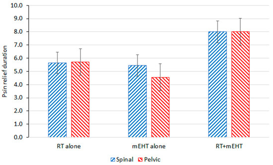 Conventionally, RT is considered an effective treatment modality for bone metastases, reducing pain in more than 50% of patients [76] and providing 12 weeks of pain relief in less than 30% of patients [90]. HT combined with RT has long been acknowledged as a treatment modality for malignant tumors, and the first phase III clinical trial [65] demonstrated the excellent capacity of complementary HT with RT to reduce pain from bone metastases. The results of the present comparative data are not different from those of the previous report. Relief of pain intensity was better in complementary HT with RT than in monotherapy, and pain relief lasted longer in the HT + RT group. Moreover, HT, as a complementary adjuvant, has immunogenic activity [84,91].