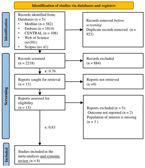 Our systematic search identified 3141 articles from five databases. After removing duplicates, 2218 articles were analyzed for title and abstract selection. In the full-text selection, 13 eligible articles were screened. Finally, we found eight eligible articles for quantitative and qualitative synthesis (see Figure 1).