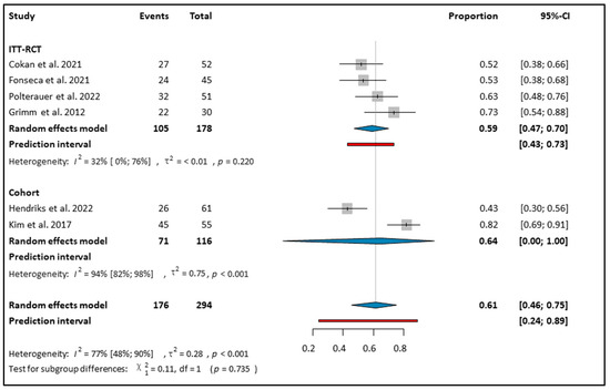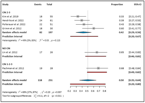 A total of 294 women received topical Imiquimod treatment for CIN 2–3 [10,12,27,28,30]. These patients showed a regression rate of 61% (CI: 0.46–0.75; I2: 77%) to CIN 1 or no disease after topical Imiquimod therapy (see Figure 2). The subgroup analysis based on study type revealed a histologic regression rate of 59% (CI: 0.47–0.70) in the ITT-RCTs, while the response rate in the cohort studies was 64% (CI: 0–1.00 I2: 94) (see Figure 2). In the PP population, which consisted of 155 patients, the regression rate was 67% (CI: 0.54–0.78; I2: 0%) (see Figure S1).
