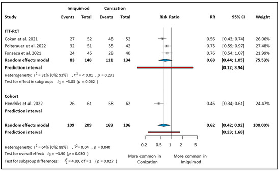In the experimental group, 196 women received Imiquimod treatment, while 196 women were in the control group who underwent conization [10,12,28,30]. Women who underwent conization had a 38% decrease in the risk of persistence or progression in CIN compared to the women who applied Imiquimod (RR: 0.62; CI: 0.42–0.92; I2: 64%) (see Figure 3). The subgroup analysis showed a randomized clinical trial where conization was superior to Imiquimod and had a 44% decrease in the risk of unsuccessful treatment (RR: 0.56; CI: 0.43–0.74) (see Figure 3) [28]. Likewise, in the PP analysis, Imiquimod was not a superior intervention to conization (RR: 0.78; CI: 0.56–1.07; I2: 0%) (see Figure S3).