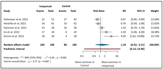 The Imiquimod group had 196 patients, while the control arm had 180 patients. Imiquimod treatment did not result in better HPV clearance compared to that of the control group (RR: 1.29; CI: 0.52–3.21; I2: 80%) (see Figure 5). In the control group, the treatment differed between the studies. When the control group received conization, it was more effective than Imiquimod (RR: 0.67; CI: 0.46–0.99) [30]. However, when no intervention was implemented in the control group and HPV infection was persistent, Imiquimod was more effective (RR: 4.20; CI: 1.62–10.89) [11]. In another study, when there was only persistent HPV positivity and no cervical dysplasia, and the control arm received no intervention, Imiquimod was more effective (RR: 2.18; CI: 1.06–4.05) [29]. In one study, the control arm had surgical interventions (conization, cryotherapy, laser) [13]. We found that in this article, Imiquimod treatment did not result in better HPV clearance than the control group (RR: 1.19; CI: 0.79–1.79) [13]. When we examined the PP group, we concluded that Imiquimod treatment did not result in a higher HPV clearance rate compared to the control group (see Figure S7).