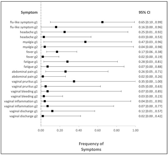 Forest plot of studies representing the frequency of all symptoms. g1: grade1, g2: grade2, CI: confidence interval.