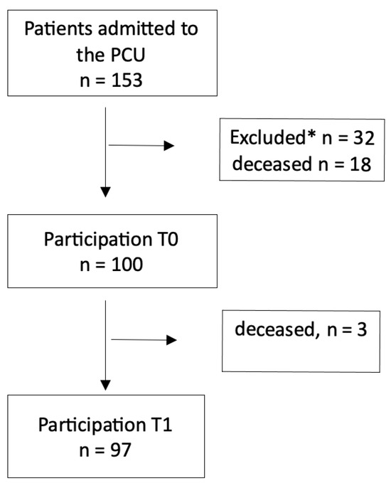 During an eight-month study period, a total of 153 patients were admitted to the PCU as shown in Figure 1. Among them, 27 patients were considered too ill to participate, while one patient encountered a language barrier, and another refused to participate. Additionally, three patients were transferred or discharged before the study commenced, and 18 patients deceased before study initiation. Ultimately, 103 patients participated in the study, with three more patients passing away before T1.