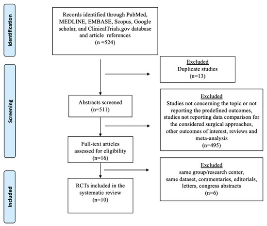 The database search retrieved 524 publications. The PRISMA flowchart for the literature search is shown in Figure 1. Among screened publications, 10 RCTs met the inclusion and exclusion criteria and were considered in the qualitative analysis. The quality of the included studies is summarized in Supplementary Figure S1. The randomization method was specified in eight studies, and the operating surgeon’s proficiency and surgical quality control were specified in nine and seven studies, respectively. Surgeon and patient blinding were reported in one study, whereas seven studies reported a dedicated powered analysis (Supplementary Table S1).