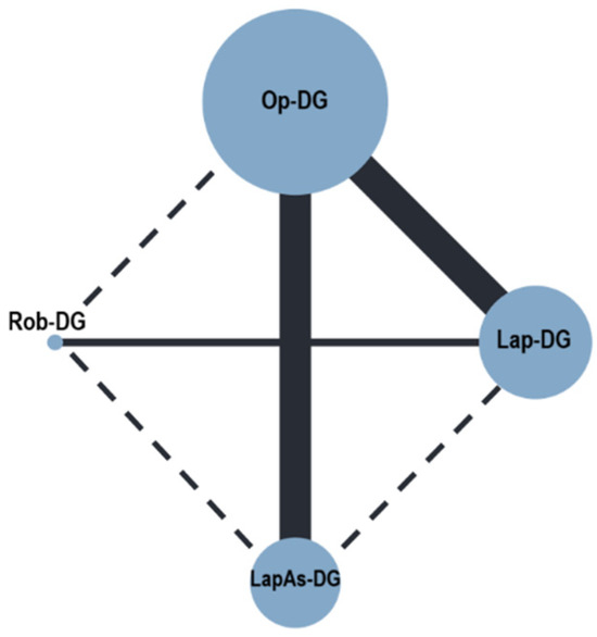 Overall, 3823 patients were included in the quantitative analysis. Demographic data are summarized in Table 1. Among them, 1012 (26.5%) underwent Lap-DG, 902 (23.6%) LapAs-DG, 1768 (46.2%) Op-DG, and 141 (3.7%) Rob-DG. The majority were males (68.4%), the age of the patient population ranged from 26 to 81 years, while preoperative BMI ranged from 19.4 to 26.7 kg/m2. The most common tumor histology was intestinal or differentiated (66.3%) and diffused or undifferentiated (33.7%). Pathologic tumor staging was detailed in nine studies: 34% were stage I tumors, 27.7% were stage II, 36.6% were stage III, and 1.7% were stage IV. Overall, 95 patients (2.5%) underwent neoadjuvant treatments, while adjuvant treatment was reported only in two studies, with 132 patients (34.9%) treated [24,34]. There were no apparent violations of the transitivity assumption. This conclusion was drawn from several factors: consistency of the common treatment (Op-DG) across trials, uniform distribution of effect modifiers across studies, and the potential for participants to be randomized to any treatment compared in the analysis. Additionally, the design-by-treatment interaction model indicated no significant inconsistency. Descriptive statistics are reported in Table 2.