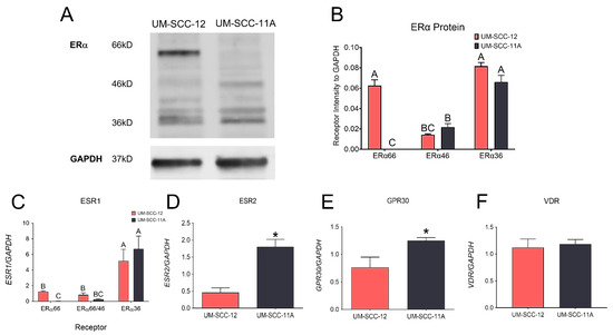 Analysis of estrogen receptor levels. Western blot analysis measured baseline protein levels of ERα66, ERα46, and ERα36 in UM-SCC-12 and UM-SCC-11A cells (n = 3/cell type) (A). Quantification of Western blot analysis (B). Gene expression of ERα66, ERα46/66, and ERα36 in UM-SCC12 and UM-SCC-11A cells (C). Quantification of estrogen receptor alpha levels is presented as the mean ± standard error of n = 6 per group. Groups not sharing a letter are statistically different at p < 0.05 by means of two-way ANOVA with a Tukey post-test. Gene expression levels of ERβ (D), GPR30 (E), and the vitamin D receptor (F) in UM-SCC-12 and UM-SCC-11A cells. Groups labeled with an asterisk (*) are statistically significant compared to UM-SCC-12 expression by means of Student’s t-test with a Tukey post-test. Graphs are presented as the mean ± standard error of n = 6 per group. All graphs are from one of two independent experiments, both with comparable results.